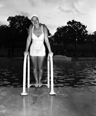 Jeanne Watts competed in women's division of city swimming at Marine Park pool. She specializes in the backstroke event. Jeanne Watts posses by stair rails of the pool. Published in the Fort Worth Star-Telegram evening edition, July 14, 1950.