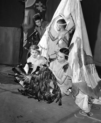 A young Native American brave at the entrance of the tent, protects village women from a pioneer attack in a scene from a "Thunderbird," which opened at McLean Junior High School amphitheater for a free showing. Acting as the Native American women, left to right, are Joanne Martin and Beebee Baker. Acting as Native American is Stephen Oliver, Freddie Hoskins is the pioneer, peering from behind the tent. The show is a joint presentation of the City Recreation Department and the fine arts department at TCU. Published in the Fort Worth Star-Telegram evening edition, July 17, 1950.