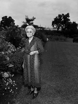 Image shows Mrs. Olivia Elvira Hiner, wife of the late Mr. Thomas H. Hiner, as she poses outside beside flowers.