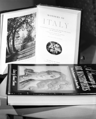 Image show two books, Wonders of Italy and Art Masterpieces: from Renaissance to the Present Day. These two books were given to the Fort Worth Art Association by Mr. and Mrs. A. L. Shuman. They are from Shuman's private library. The leather bound "Wonders of Italy" was purchased by them in Rome in 1927.