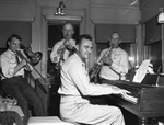 Midland musicians whoop it up on the Lions Texas Special, en route to the Lions International convention in Chicago. Left to right, Jerry Roberts, T. J. Inman, C. A. Churchill and Pianist John Stringer. They arrived in Chicago. Published in Fort Worth Star-Telegram, morning edition July 16, 1950.