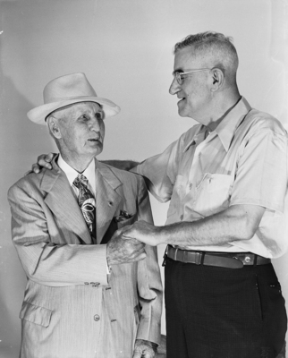 It was a friendly clasp and a pat on the back for these two veteran railroaders whose years with the Texas & Pacific Railway make them a member of the same club. Harry Wood Hedges, left, recently retired after 46 years of service and Ferdinand WIlliam Attinger, right, retired after 41 years' service. Published in Fort Worth Star-Telegram, evening edition July 17, 1950