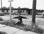 Image shows Sgt. E. D. Vanderworth of State Highway Patrol squatted between two poles along Virginia Lane outside of new patrol building. Sgt. E. D. Vanderworth of State Highway Patrol shows how narrow the space between a telephone post and street sign.