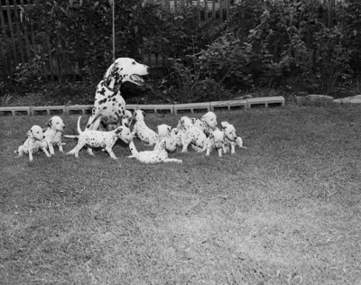 Image shows Cindy, 2 year old Dalmation, owned by Miss Tary McGown of 1908 Fairmount, is shown with her second litter of 12 puppies. Four female and 8 males, three of the first litter of 12 died. After five weeks Miss McGown is ready to sell them. Their father is Knobby, a thoroughbred Dalmation.