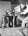This live shot was made while Bobby Peters, center, was on the air night with the debut of his first regular show on WBAP-TV. Called "Lucky Ladies" the program pits wife against husband as in the impending siphon bottle battle between Mr. and Mrs. Ray C. Rankin o 1216 Pennsylvania. Published in Fort Worth Star-Telegram, evening edition, July 16, 1950.