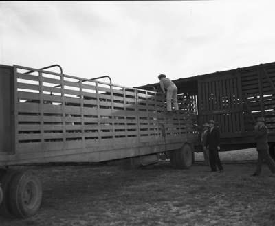 Final touches are being added to buildings and grounds for the Southwestern Exposition and Fat Stock Show. The picture was snapped as 125 Brahman calves were unloaded here for the rodeo's calf-roping contests.