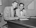 Image shows Pat McGlothin, left, pitcher obtained from Montreal in a five player deal with Brooklyn. He signs a contract under supervision of Wallace Jay, right, business manager of the Fort Worth club. He left for San Antonio to Join Cats after.