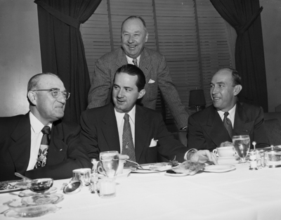 Image shows a campaign breakfast with Governor Shivers and Texas Christian University (TCU) president, Sadler. Governor Shivers, center is shown at campaign breakfast. From left to right, TCU president, Bill Brown, campaign chairman, right, and Neville Penrose, standing. Published in the Fort Worth Star-Telegram evening edition, July 15, 1950.