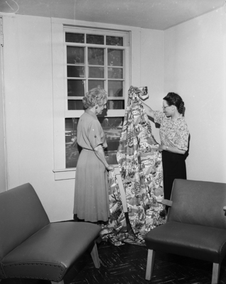Mrs. Elmer G. Withers, top left, and Mrs. Leona Howard, hostesses, do some last minute drapery hanging for the Fort Worth Servicemen's Center. Published in Fort Worth Star-Telegram, morning edition July 17 1950.
