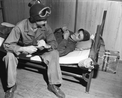 Civilians turned into GI's when elements of the 49th Armored Division collected at Eagle Mountain Lake National Guard Base preparatory to leaving for two weeks training at Fort Hood. And there was the usual GI talk when Private officer J. C. Parks, 4513 Tallman, and Corporal A. M. Lamb, Village Creek, took a break. Published in Fort Worth Star-Telegram, morning edition July 16, 1950.