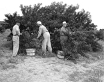Image shows Walter Branton, Irving Booker and J. E. Spencer, from Easterland County, picking peaches in the Spencer orchard. Published in the Fort Worth Star-Telegram morning edition, August 6, 1950.