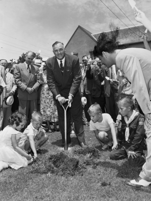 Everybody got into the act as ground was broken for the new Arlington Heights Methodist Church sanctuary. Helping out the preacher, Rev. C. A. Sutton, right, are Sharon Adams, left, and Ken Cropper. Looking on is Sharon's father, T. A. Adams Jr., chairman of the stewards. Published in Fort Worth Star-Telegram, morning edition July 17 1950.