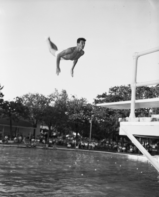 Navy Photographers Mate Bert Fox was in the middle of his back 1 and half somersault layout, one of the six dives he performed in winning the men's three-meter fancy diving championship in the city swimming meet. Published in the Fort Worth Star-Telegram in morning edition, July 16, 1950.
