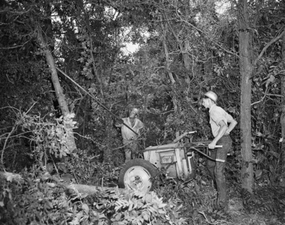 Image shows the clearing Trinity floodway of trees and tangled underbrush. In preparation to channel excavation from Baurline to the lower Rock Island bridge under the first $89,999 floodway contract. T. L. Tidwell, Grapevine, right, operates a power saw and K. P. Grantland, Colbert, Oklahoma, guides the fall. Published in the Fort Worth Star-Telegram morning edition, July 19, 1950.