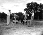 Image shows Charles S. Cox jr., Belton, left and Dick Sickler, Belton right, beside two herd bulls on the Charles S. Cox & Son ranch. Charles cox, left is holding Mixer Royal 12th and Dick Sickler, herdsman, poses Dandy Larry Domino 32nd. Published in the Fort Worth Star-Telegram morning edition, September 3, 1950.