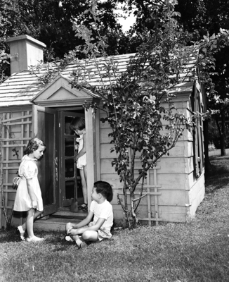 Madelon Leonard, left, Ambler Cantey and Rally McClure are keeping the house on a Lilliputian scale. Madelon is the fourth Leonard daughter to enjoy the house, which is built to scale. Madelon Leonard is standing in front of the house next to the door, another girl is inside the house sweeping, while the boy seats on the grass next to the door of the house. Published in the Fort Worth Star-Telegram morning edition, July 23, 1950.