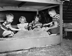 The Leatherbury children play in the sand pile. Pictured are David, left, Hester Louise and John Leatherbury, right, with Margaret Magee, second from right. Published in the Fort Worth Star-Telegram morning edition, July 23, 1950.