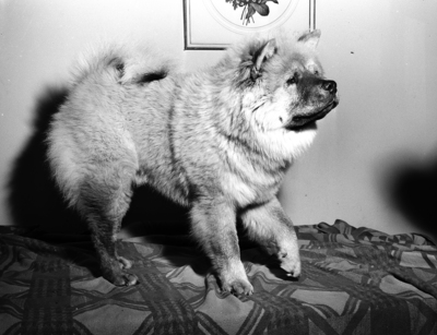 Sandy Jo, owned by Mrs. Bessie Faye Beird, 2724 Strong, was best of breed at the Fort Worth Kennel Club show in Trinity Park. The seven-month old chow was also fourth in the non-sporting variety group. The dog stands on a bed. Published in the Fort Worth Star-Telegram morning edition, July 23, 1950.