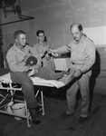 Pvt. Elmer Hoelscher of Temple gets a mashed toe treated by Major H. V. Marlin, also Temple, right, and Second Lieutenant Lloyd E. Spencer, of Commerce. The injury was received during maneuvers of the 49th Armored Division, Texas National Guard, at Fort Hood. Published in Fort Worth Star-Telegram, morning edition July 20, 1950.