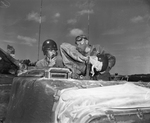 Staff Sergeant Harry Cohen of Mineral Wells, left, tank commander, Private Paul Moore of Graford get ready to pull out during a problem being run by Company B of the 145th Medium Tank Battalion in maneuvers of the 49th Armored Division, Texas National Guard, at Fort Hood. Published in Fort Worth Star-Telegram, morning edition July 20, 1950.