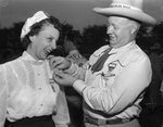 Mrs. J. M. Bunkley, music teacher at Arlington State College, is shown receiving a souvenir boot from Dr. H. G. Buxton of the Arlington Heights Lions Club at the Lions International convention in Chicago. Published in Fort Worth Star-Telegram, evening edition July 19, 1950.