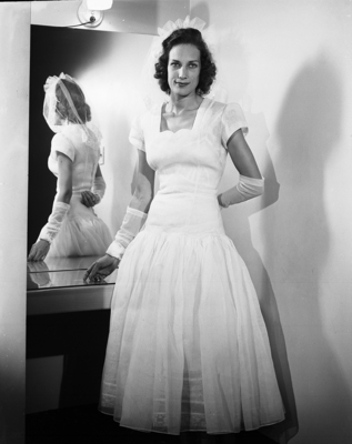 Mrs. Don Ashwell Perry is shown posing her wedding gown, standing in front of a mirror. Published in the morning edition, July 23, 1950.