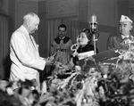 Mrs. F. G. Howell, right, presenting a trophy to Amon Carter at the 4th Division Legion convention at Hotel Texas.