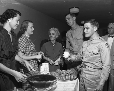 Ready to give and receive a welcome at the new Fort Worth Armed Forces Center, 516 West 5th, when it opened were, left to right, hostesses Joan Holloway and Patsy Iverson and Senior Hostess Mrs. Elmer G. Withers with Sergeant Earl Boyd and Corporal Richard Lowe. Published in Fort Worth Star-Telegram, morning edition July 20 1950.