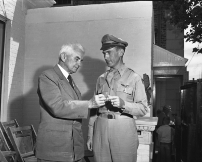 Ready to give and receive a welcome at the new Fort Worth Armed Forces Center, 516 West 5th, when it opened were, left to right, Captain William L. Smith of Carswell Air Base, executive director of the center, receives the key to the building from Reverend James K. Thompson in the final act of the dedication ceremonies. Published in Fort Worth Star-Telegram, morning edition July 20 1950.