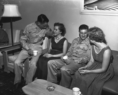 Ready to give and receive a welcome at the new Fort Worth Armed Forces Center, 516 West 5th, when it opened were, left to right, S/Sgt. John T. Sutton, Miss Rosemary Orton, Private Officers Earl Ladd and Miss Bobbie Wynne. Published in Fort Worth Star-Telegram, morning edition July 20 1950.