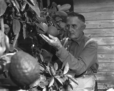 B. C. Bedford, 519 Hudgins, displays two of the grapefruit-sized lemons growing on a tree in his yard. The pale yellow fruit often weigh from two and a half to three pounds each. Bedford, a retired carpenter, protects the tree each winter with a small wooden house and an oil stove. Published in Fort Worth Star-Telegram, evening edition July 21 1950.