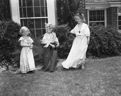 "Let's play lady" is one of the favorite past times of most little girls. The game is demonstrated here by Edith Ann, Diane and Susan, left to right, daughters of Mr. and Mrs. Homer Tomlinson Jr., 3059 Odessa. Published in Fort Worth Star-Telegram, morning edition July 23 1950.