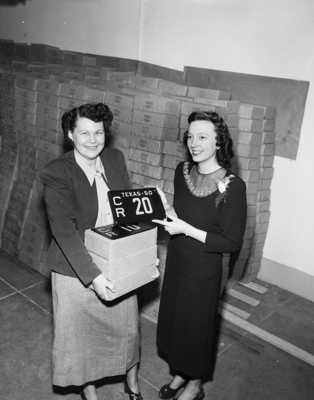 More than 100,000 automobiles licenses plates for 1950 arrived for storage in the tax assessor-collector's office until sales begin. Deputy clerks Mrs. Betty Horn and Mrs. Jean Bowers, left to right, stack and examine the plates with black background and yellow numbers.
