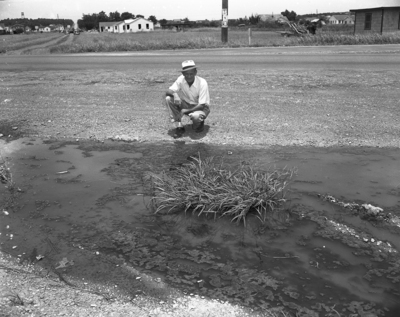 A. B. Holden, owner of a lumberyard at 5252 Mansfield Highway, views the sewage overflow which pools up each morning in front of his place of business and runs along the highway for about half a mile. Published in Fort Worth Star-Telegram, morning edition July 25 1950.