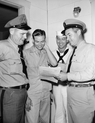 John L. Broyles, 26, second from the left, of 2012 Ross, his orders to immediate active duty in the Navy as well as by detail of sailors and police to hand him his greetings. Broyles is married and has one child. He is a radioman second class who served three years in World War II. He is flanked on his left by Motorcycle Officer Jimmy Segrest and on his right by Aviation Machinist Mate B.C. Davidson and Aviation Chief Radioman C.H. Lewis.