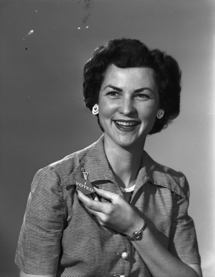 Miss Carlie Allen, 2805 Lubbock, shows one of 5000 red and white tags to be passed out by the Jaycees at polling places in Fort Worth, winding up their annual "Get Out the Vote" campaign. Published in Fort Worth Star-Telegram, evening edition July 21 1950.