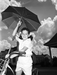 Young Alice Ann Shryoc is shown on her bicycle. She is shown outside, looking at the camera, with her hands grasping the attached umbrella of her bicycle. Published in the morning edition, August 6, 1950.