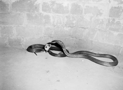 A pair of Malayan cobras recently added to the collection of reptiles in the Forest Park Zoo spread their hoods and eye each other coldly. Spreading the hood which begins just back of the head is a cobra sign of anger. Published in Fort Worth Star-Telegram morning edition July 27, 1950.