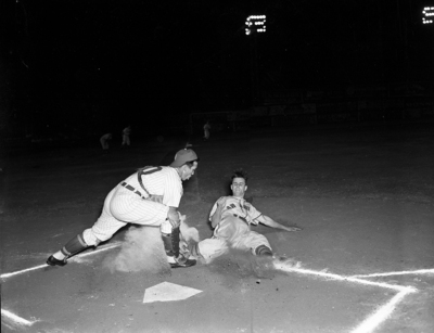 Image shows a baseball game between Fort Worth Cats and San Antonio. Shows shortstop John Sullivan, San Antonio, right, sliding into base. Bobby Bragan tags Sullivan out at La Grave Field. Published in the Fort Worth Star-Telegram morning edition, July 23, 1950.