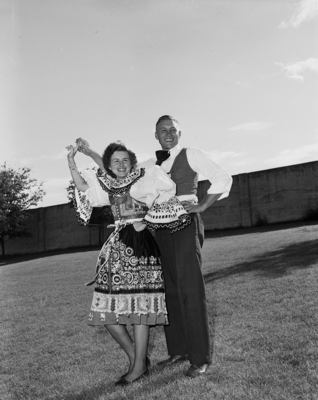 This couple from Temple were among the colorfully attired teams which performed the Czechoslovakian national dance, "Beseda" at the American Sokol Organization's southern division convention held here at Farrington Field. They are Miss Carolyn Caufal and Frank Klinkovsky, in native Czech costumes. Published in Fort Worth Star-Telegram, evening edition July 24 1950.