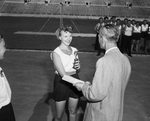 Miss Frances Milan, Fort Worth model, receives a cup from Ben Prevratil, president of the Southern Sokol division, on behalf of the Fort Worth women's team which was a winner in competitions at Farrington Field. Published in Fort Worth Star-Telegram, morning edition July 24 1950.
