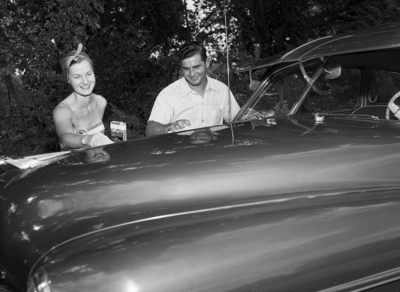 Mr. and Mrs. Angelo and Bobbie Dear, of 4412 Standish Road, are among the many who take advantage Forest park's deep shade to gave their cars a needed polish job. Published in Fort Worth Star-Telegram morning edition July 30, 1950.