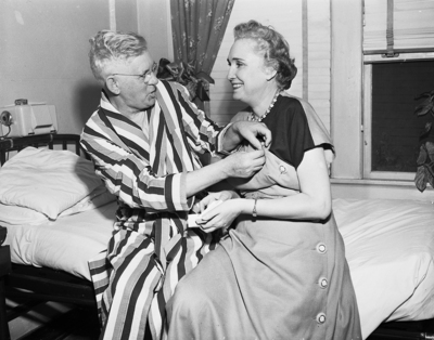 Miss Blanche Lotspeich is show as she receives a service pin, along with a $100 vacation bonus, for her 25 years of continued service with H. J. Justin & Sons. The gifts were awarded by John S. Justin, the company president, in his room at All Saints Hospital, where he was staying at the time in convalescence. Miss Lotspeich was the first employee hired by the boot-shoe firm after it moved to Fort Worth from Nocona in 1925. Published in the evening edition, July 25, 1950.
