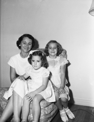 Mrs. Pat McClure of Midland and daughters, Mary Lee, center, and Kathy, are here with Mr. McClure for the summer and are visiting his mother, Mrs. Mary McClure, 3909 Byers. Published in the Fort Worth Star-Telegram evening edition, July 26, 1950.