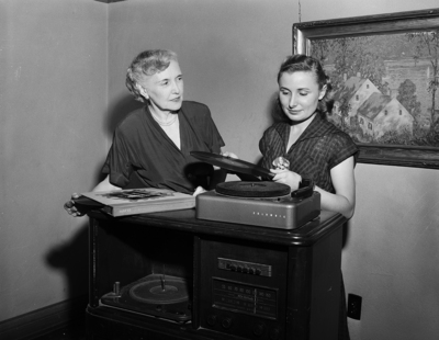 The staff of the music section of the Fort Worth Public Library play for themselves a recording of Johann Sebastian Bach, remembering the 200th anniversary of the composer's death. Mrs. T. L. Lawrence, left, and the director of the music and art section, Miss Lirl Treuter, Published in the morning edition, July 30, 1950.