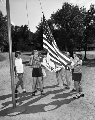 At Camp Fire Camp El Tesoro, young Delmar Durant, shown second form the left, stands next to the American Flag. Several other unidentified children are visible standing with her as the raise the flag on the flagpole. Published in the morning edition, July 30, 1950.