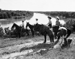 At Camp Fire Camp El Tesoro, camp instructors Misses Margaret Leard (far left) and Catherine Moore (center left), are shown riding on horses. Misses Jean Joy Johnson, (center right), and Jo Ellen Griffin (right), are also visible. Published in the morning edition, July 30, 1950.