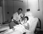 John E. Glassie Jr., former Rice Institute fullback and football coach, helps his wife, a polio patient at City-County Hospital, pretty up for an ambulance trip to Gonzales Warm Springs Foundation for convalescent treatment. Mrs. Glassie, 26, has been under treatment here. Published in the Fort Worth Star-Telegram morning edition, July 27, 1950.