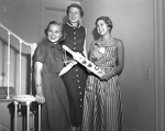 Misses Ann Robinett, Nancy Romine and Sally Schorr, left to right, examine a freshman paddle from William Woods College at Fulton, Missouri, where all three are students. Miss Schorr, whose home is St. Louis, is the guest of Misses Robinet and Romine. Published in the Fort Worth Star-Telegram morning edition, July 27, 1950.