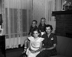 Image shows Mrs. Lacroix and her children, Valjean, Lary and Gary, staying as guests of her parents, Mr. and Mrs. E.E. Henson, 3205 S. Jennings. They are with Mr. Lacroix (not pictured) in living room.